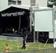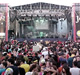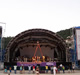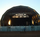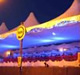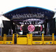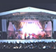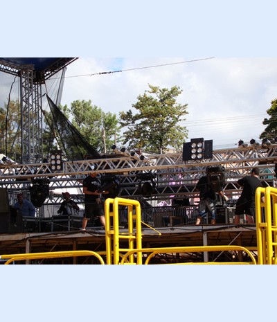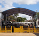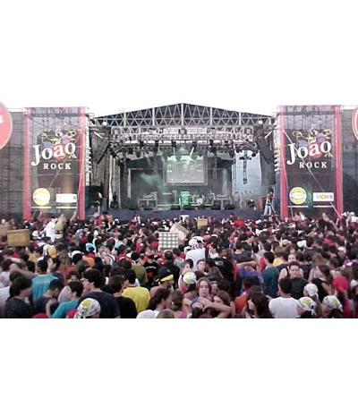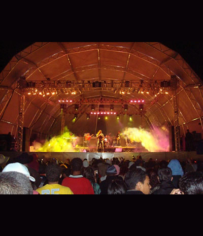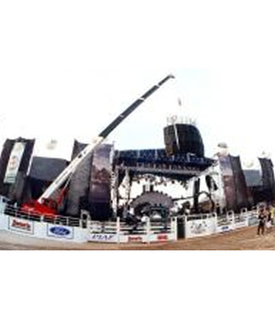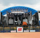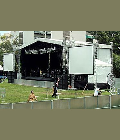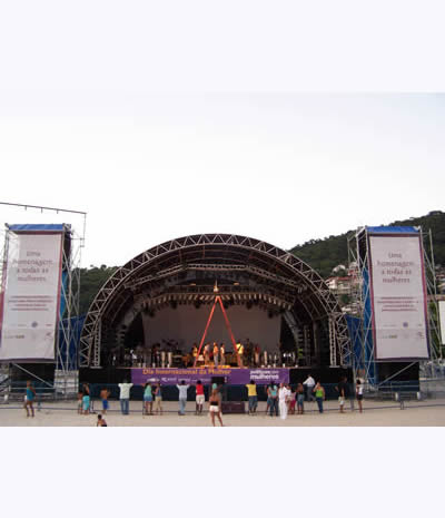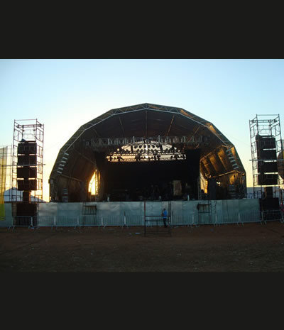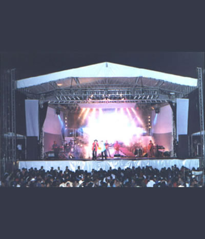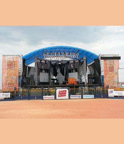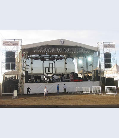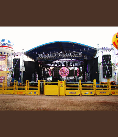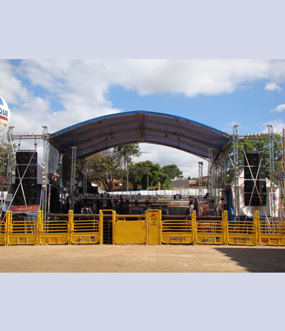 Palcos em estrutura metálica em sistema de treliça com perfil em alumínio com cobertura em lona anti-chama e piso em madeirite naval com House Mix.