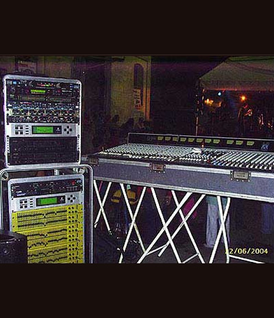 Mesas de P.A. e monitor de 24 à 48 canais, Mesas digitais, racks de periféricos e efeitos de última geração, microfones Shure, AKG, Senheiser (com e sem fio).