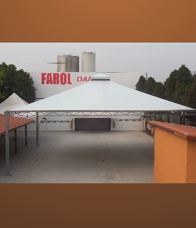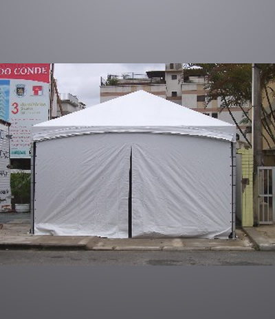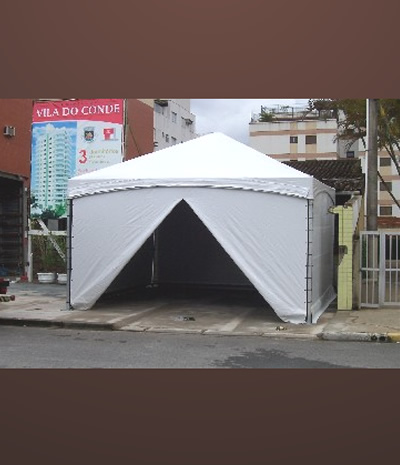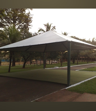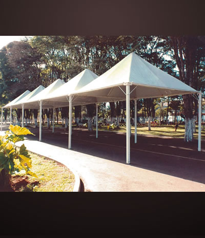 Confeccionadas em tecido sintético (lona) especial, anti-chama, anti-mofo, anti-fungos e anti-raios u.v, com ou sem fechamentos laterais. Estrutura da cobertura em estrutura metálica, tratado galvanizado e pode ser montado em qualquer tipo de solo. Tendas piramidais do tipo árabe ou no modelo chapéu de bruxa, podendo ser acopladas de modo a formar áreas cobertas nas mais variadas dimensões, com a utilização de calhas intermediárias.